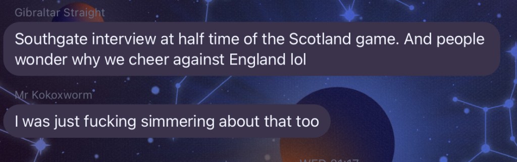 This is not just a proud nation, it’s a proud footballing one. In the past 24 hours, I don’t think anyone has done more for Scottish independence than Gary Lineker and the BBC producers for broadcasting an interview with the ENGLAND manager during halftime of the SCOTLAND game. Yes, they have airtime to fill. Yes, they are both “home nations”. But this really gets Scottish football fans. The footballing discourse, the punditry, the analysis, the time filler. It’s all through an English lens. Does a Scotland fan want to hear whether or not Ollie Watkins is frustrated with not starting instead of analysing how Billy Gilmore suddenly became the greatest midfielder on the planet? No.